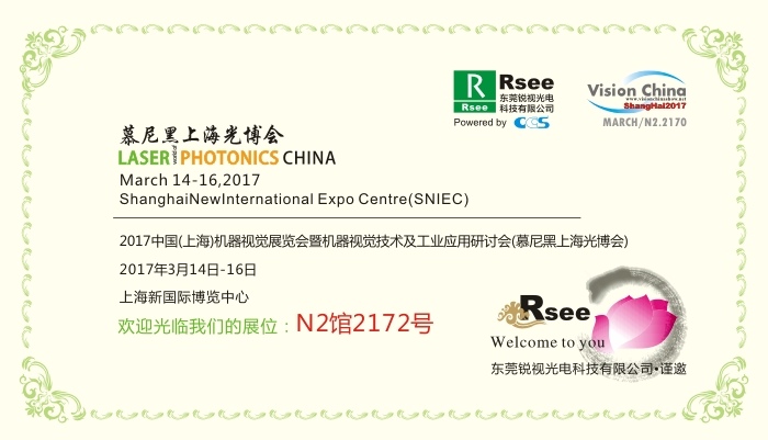 中國(上海)機(jī)器視覺展暨機(jī)器視覺技術(shù)及工業(yè)應(yīng)用研討會(huì),同期2017年慕尼黑上海光博會(huì)(LASER World of PHOTONICS CHINA 2017)將于2017年3月14至16日在上海新國際博覽中心舉辦。東莞銳視光電科技有限公司將出席,展位號(hào)N2.2172。