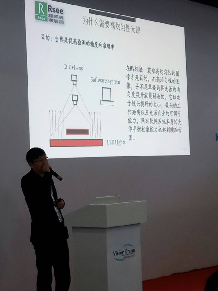 展會(huì)同期,銳視光電總經(jīng)理王華博士應(yīng)機(jī)器視覺技術(shù)及工業(yè)應(yīng)用研討會(huì)邀請(qǐng),發(fā)表以“高均勻性LED光源的應(yīng)用與設(shè)計(jì)”為主題的演講討論。