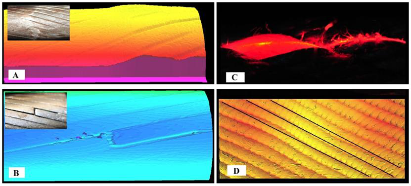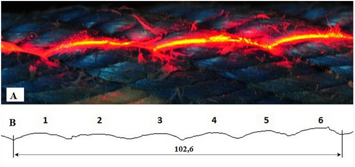 利用繩索表面的三維圖像的允許的缺陷進(jìn)行檢測。測試過程中記錄的缺陷為鋼絲繩和纖維繩有所不同。在鋼繩索的情況下,缺陷包括在形成線料,在圖6b所示的瓶頸或在圖6a為可見股線的排列凹槽,和裂縫的股線,或?qū)Ь€。在纖維繩的情況下,在鏈結(jié)構(gòu)的變形的形式的缺陷已被識別,如圖6d中,以及股線的磨損表面層,如圖6c中投射激光線影像中。這些扭曲也可以在圖6d的在鏈面的局部變形的形式的底部部分可以看到。