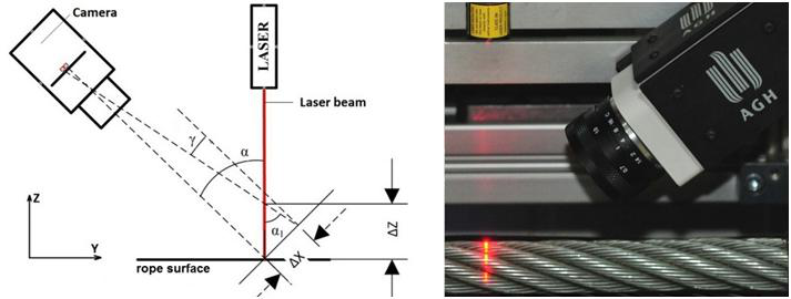 視覺系統(tǒng)的配置如圖1所示。激光束照亮繩子的關(guān)系在其軸線的90°。相機(jī)設(shè)定在45°角度的激光平面(圖1)。這樣的配置,得到各軸,分別為以下決議:Δx = 0.15 [毫米],Δy = 0.15 [毫米],Δz = 0.21 [毫米]