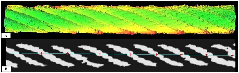 繩索表面的三維圖像之前的任何測量程序進(jìn)行預(yù)處理。這是為了去除任何“噪音”可見的繩索表面的圖像中,并進(jìn)行測量(圖3a)做準(zhǔn)備。測量算法基于檢測股線的邊緣,如形成繩子的表面和其分割(圖3b)的小線。然后,對于每個(gè)繩股的,特征點(diǎn)被確定,它定義了繩索的軸線上方的繩股的最大高度。繩的間距長度是根據(jù)一給定鏈的邊緣或特征點(diǎn)之間的距離進(jìn)行測量。一股的部分是3D圖像上的白點(diǎn)可見。