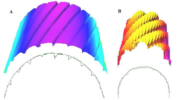 測量節(jié)距長度的另一種方法是配置視覺系統(tǒng),以便該激光線平行于繩索的軸線。在這種情況下,繩索表面示出了形成繩的直徑股線的布置。在所提出的配置節(jié)距長度可以為每個(gè)繩股的測定。在間距長度的變化的分析允許繩索或他們的傷害(圖4)的磨損的間接評估。應(yīng)注意在圖像中由激光線的失真支付給任何的多股纖維的損傷,可見。在3D圖像這一附加信息定義到繩子損壞。圖4b示出了繩索表面的過濾高度輪廓,用于測量所述繩的間距長度制備。