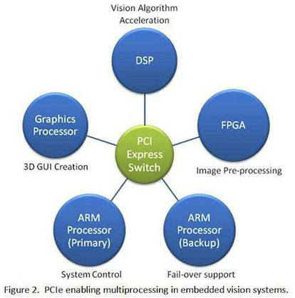 當(dāng)每個(gè)系統(tǒng)中的具有PCIe接口的處理器,PCIe交換機(jī)可以被用來使高帶寬,它們之間的低等待時(shí)間的通信。選擇的PCIe交換機(jī)即使提供兩個(gè)根復(fù)合體端口,其允許備份主處理器,諸如上述的ARM,可以快速切換到系統(tǒng)中,如果第一主機(jī)處理器出現(xiàn)故障。圖2示出如何在一個(gè)嵌入式視覺系統(tǒng)的各個(gè)處理器可以經(jīng)由PCIe交換機(jī)互連。