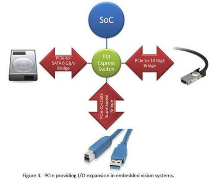 PCIe提供在提供擴(kuò)展端口,新興的互連技術(shù),如10千兆以太網(wǎng),超高速USB(USB3),和SATA6 Gbit / s的形式以這樣的高度集成的SoC的另一重要的作用。這些橋梁的PCIe給輸入/輸出(I / O),這些還不夠成熟的發(fā)展過程中,被整合到SoC技術(shù)的SoC訪問。在本質(zhì)上,PCIe總線的作用是面向未來的SOC的I / O能力。圖3顯示的PCIe橋接怎么可以用來擴(kuò)大嵌入式視覺系統(tǒng)的I / O能力。