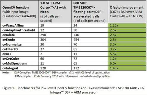 一種加速視覺算法DSP(圖1顯示了可以由DSP卸載從流行的開放計(jì)算機(jī)視覺(OpenCV的)庫樣本的實(shí)時(shí)圖像處理功能可實(shí)現(xiàn)的性能改進(jìn)。)